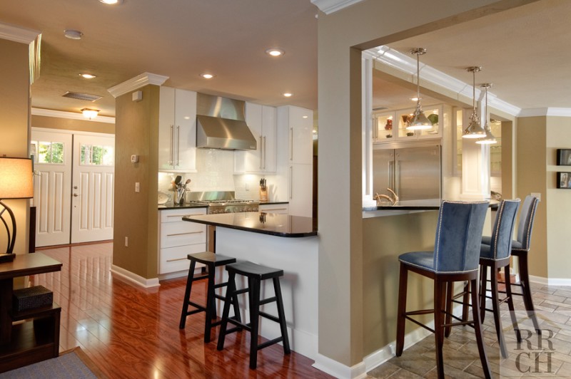 This 1970s era home got a little bit of everything while we were there! From the front door to the back porch, we pretty much addressed it all. As this owner awaited the arrival of her new little one, we gave the mama-to-be a professional grade kitchen, a lush master bathroom, a custom banquette, a super slick alligator-look tile fireplace surround… pretty cool for these giant Gator fans!